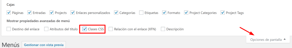 El primer paso sera crear una nueva clase dentro del ítem del menú que queremos resaltar. Para eso ingresa en APARIENCIA > MENÚ haz clic en OPCIONES DE PANTALLA y habilita la opción CLASE CSS del panel superior de WordPress.