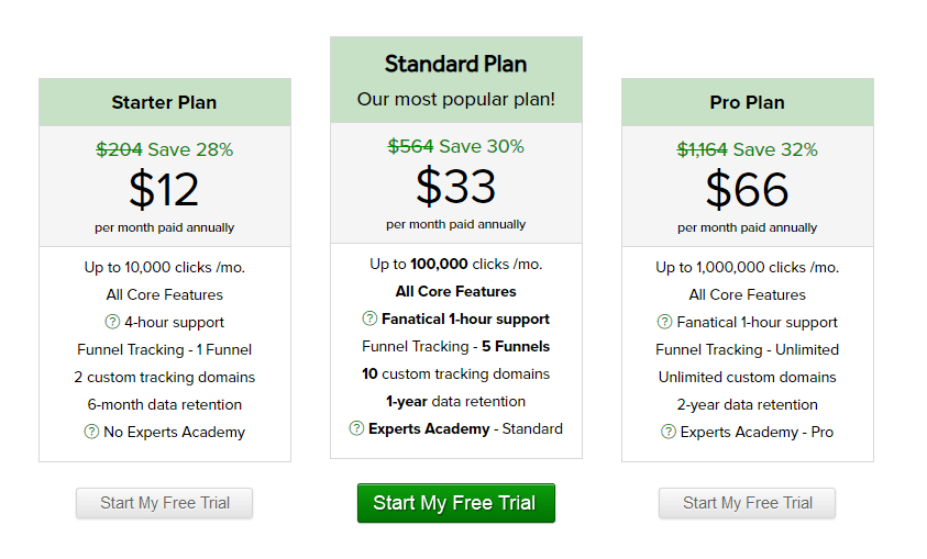 Si elegís el Plan Básico ($17 por mes) y el número de clics que recibís excede los 10000, te darán un 10% “de congelamiento”; cuando excedas los 11000, tu cuenta se va a actualizar de manera automática al Plan Estándar y se te facturarán $47, y así cada mes. Debes recordar ir a tu cuenta y bajar la categoría manualmente (lo podes hacer por un clic) si quieres volver al Plan Básico.