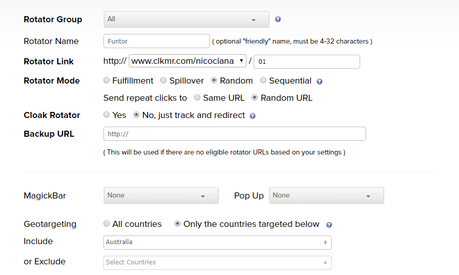 Son una herramienta esencial y poderosa para los proveedores de tráfico. Se puede configurar más de una destinación de URL bajo un link, y “rotar”. Por ejemplo, vos le vendes un tráfico a Comprador A y Comprador B. Cada comprador te da un enlace de URL para su sitio web. Vos configuras tanto el URL-A como el URL-B bajo un URL de enlace rotador que comience con http://www.clkmr.com/…