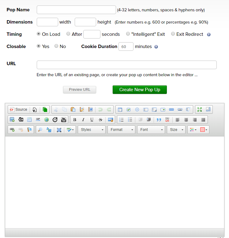 Utilizando un editor gráfico para diseñar un Popup, podes agregarle casi todo lo que se te ocurra al popup – no solamente imágenes o tablas, también podes agregar videos de YouTube incorporados, agregándole sonido, y también un temporizador que haga la cuenta regresiva.