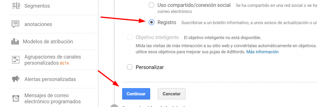 En el siguiente paso tendremos que configurar el tipo de objetivo al cual queremos hacer el seguimiento, entre las diferentes propuestas que Google Analytics ofrece realizar seguimientos de (ingresos, adquisición, consultas, interacción). En este tutorial, como he comentado con anterioridad realizare un seguimiento de las suscripciones realizadas desde el formulario que hay en la pagina de inicio de mi blog.