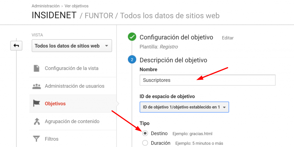 En el siguiente paso deberás asignar un nombre al objetivo que estas configurando y una pagina de destino.