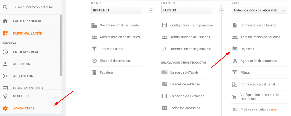 Empecemos a configurar esta conversión en Google Analytics. Lo primero sera ingresar en Google Analytics, sobre el lado lateral de tu pantalla podrás visualizar el botón de Administrar (haz clic) y luego en la tercera columna haz clic en Objetivos.