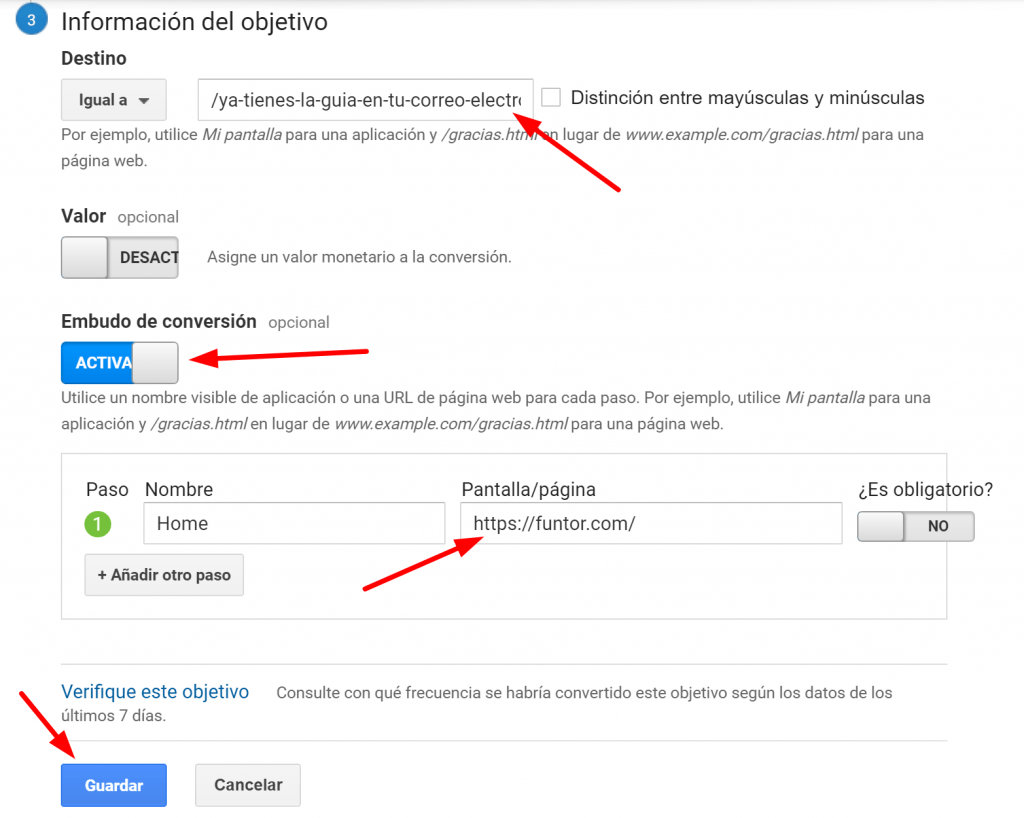En la opción IGUAL A, deberás insertar la url objetivo, es decir la url donde el usuario sera redirigido después de la compra o suscripción, lo que generalmente se hace llamar Thanks Page. En caso de que haya un proceso que el usuario deba seguir antes de completar la compra, selecciona la opción embudo que lo que hará es indicar cuales son los pasos que debe seguir el usuario antes de ser contabilizada la conversión. Selecciona Guardar para terminar el proceso.