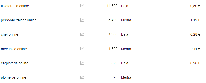 Mira esto que extraje de Google AdWords…. es evidente que la gente esta comenzando a buscar todo tipo de servicios online y aunque algunos reflejen pocas búsquedas hay otros que podrías sorprenderte.