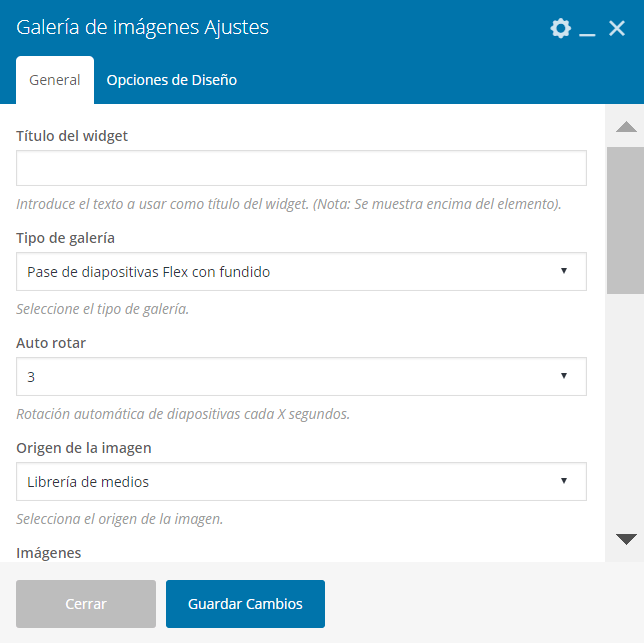 Haga clic en cualquier elemento para abrir sus opciones. A continuación se muestra un ejemplo de las “opciones” del elemento imagen. Como puede ver, cada módulo puede tener muchas configuraciones e incluso múltiples pestañas de configuraciones.