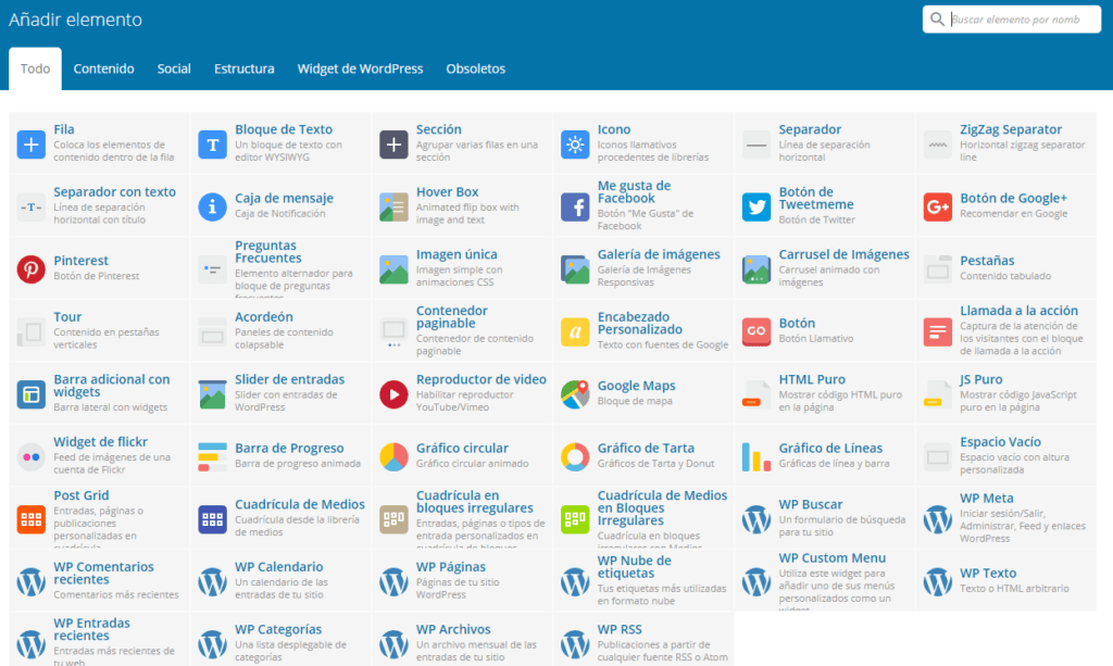 Además, según el tema de WordPress y los complementos compatibles que esté utilizando con Visual Composer, verá más o menos elementos de página.