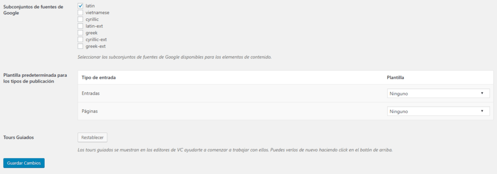 Visual Composer no solo trabaja como creador de páginas sino que también funciona muy bien con entradas y tipos de publicaciones personalizadas. Todo lo que tienes que hacer es habilitar esta opción. Dirigete a Configuración> Visual Composer. Debería visualizar una pantalla similar a esta: