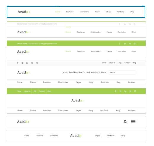 Avada Theme presenta una gran cantidad de opciones de cabecera, lo cual de alguna manera permite una mayor personalización del mismo.  Como lo indica la siguiente imagen ofrece 7 opciones diferentes de cabeceras + la opción de tener una navegación vertical a la derecha o a la izquierda, es decir que tenemos en total 9 opciones de cabecera.