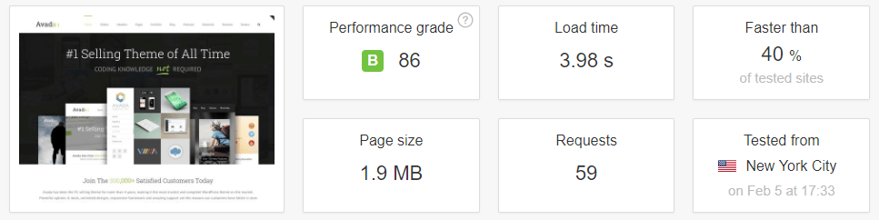 Respecto a la optimización en la descripción ThemeFusion mencionan que es un tema optimizado con los cual se pueden conseguir buenos tiempos de carga. En mi caso haré un test de velocidad y veremos que es lo que nos dicen las métricas, ten en cuenta que estare haciendo un test con un servidor compartido (Hostgator), con lo cual los tiempos de carga siempre pueden mejorar si trabajar con un VPS optimizado.