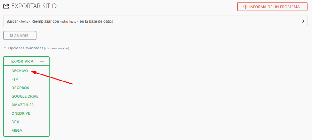 Una vez que ya tengas el plugin All in One migration en tu instalación de WordPress, sobre tu barra lateral derecha tendrás un nuevo botón con el nombre All-In-One Wp Migration, haz clic y selecciona la opción Exportar, como podrás ver en la siguiente imagen tienes diferentes opciones de exportación, pero la versión gratuita solo te permite exportar a un archivo comprimido, es decir la opción Archivo.