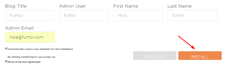 Completa los datos del siguiente formulario para proceder a la instalación y haz clic en Install.