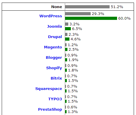 Meses atrás podíamos observar la implantación de cuota de mercado de WordPress comparado con el resto de CMS nos sorprendía la redonda cifra de WordPress ya era el 25% de internet y, nada menos que, el 58,7% de la cuota de CMS. Pero aun así, las últimas cifras no hacen más que aumentar y aumentar la importancia del WordPress en el presente y en el futuro de internet, asimismo atendiendo hasta los últimos datos de W3Techs, donde WordPress sigue subiendo en implantación el resto de CMS bajan su cuota.